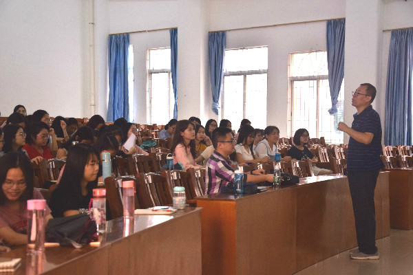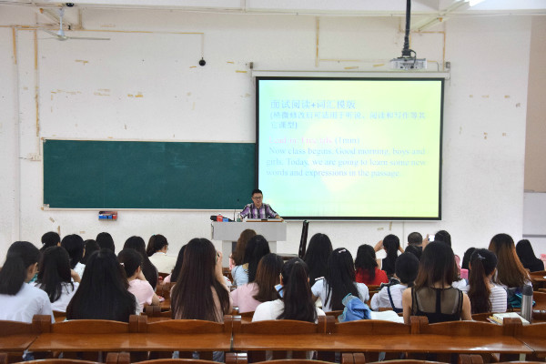为响应学校“名师进校园”号召,深入推进“新师范”建设与校地协同育人工作,9月14日上午,外国语学院英语系邀请到湛江二中袁琦老师为2015级即将去实习的同学们做有关英语教学工作的指导讲座。系主任陈尚真老师主持并致欢迎词,15届英语全体同学参加本次讲座。