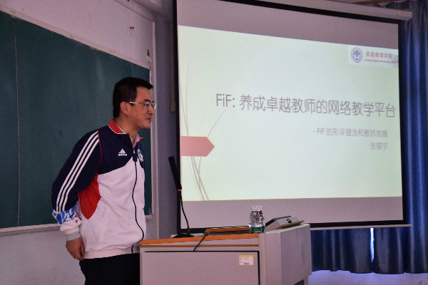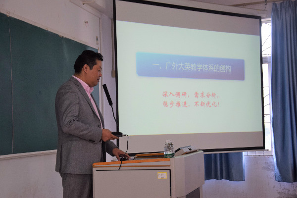 首先,由陈金诗博士讲授主题为“大学英语教学体系与基于FiF平台的教学改革”的相关内容。内容分为三个部分:广外大英教学体系的创构、基于形成性评价的教学实践、大英教改研究的相关课题。在第一部分内容中,陈金诗博士指出广外大英教学体系创构的理据是需求分析,并从课程本体的需求、国际化人才培养的需求及学生的外语学习需求三个方面结合广外实际情况进行具体讲解;接着陈博士根据广外2015年的大学英语教学计划和大英课程的三大板块为老师们介绍广外的全能提高型大学英语课程设置;然后他指出教学理念与方法是以输入为基础,输出为驱动,并注重课堂内外互补,实现以输入为基础的有效输出;另外他还提到了基于形评理念开发的大英FiF电子档案袋平台及其教学环节和特点。在第二部分内容中,陈博士通过介绍FiF教学评估系统的运用来阐述基于形成性评价的教学实践。在第三部分内容中,陈博士简单介绍一些大英教改研究的相关课题,让老师们能够知晓全国全省在这方面的动态。