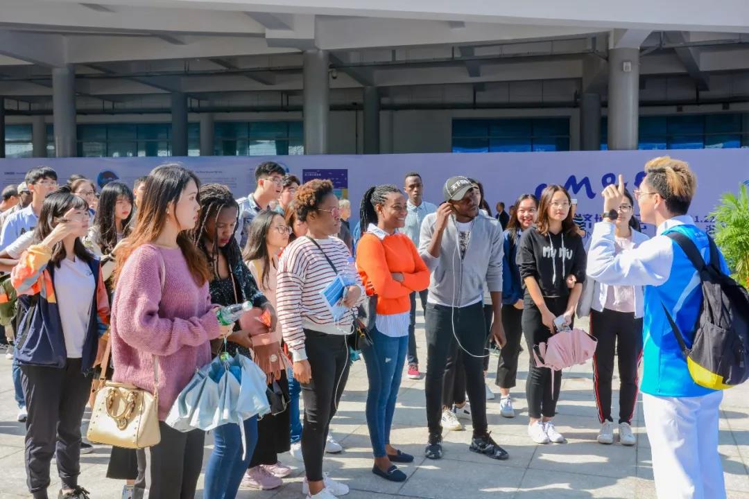 报名水产国际商务班的同学以及留学生在老师的带领下有秩序地参展
