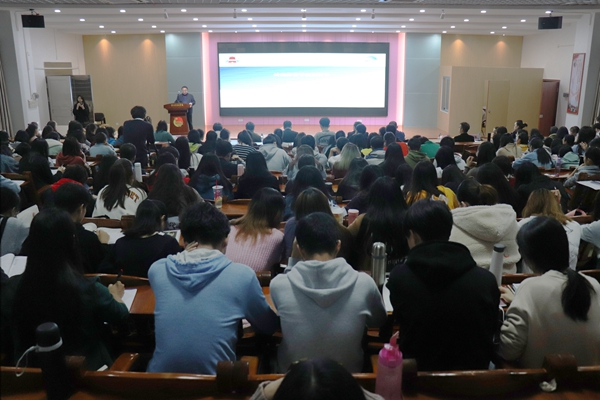 外国语学院副院长杨红主持会议。学校相关职能部门负责人、外国语学院、水产国际商务学院领导和教师、水产国际商务班全体学生、商务英语专业全体学生共300多人参加了会议。