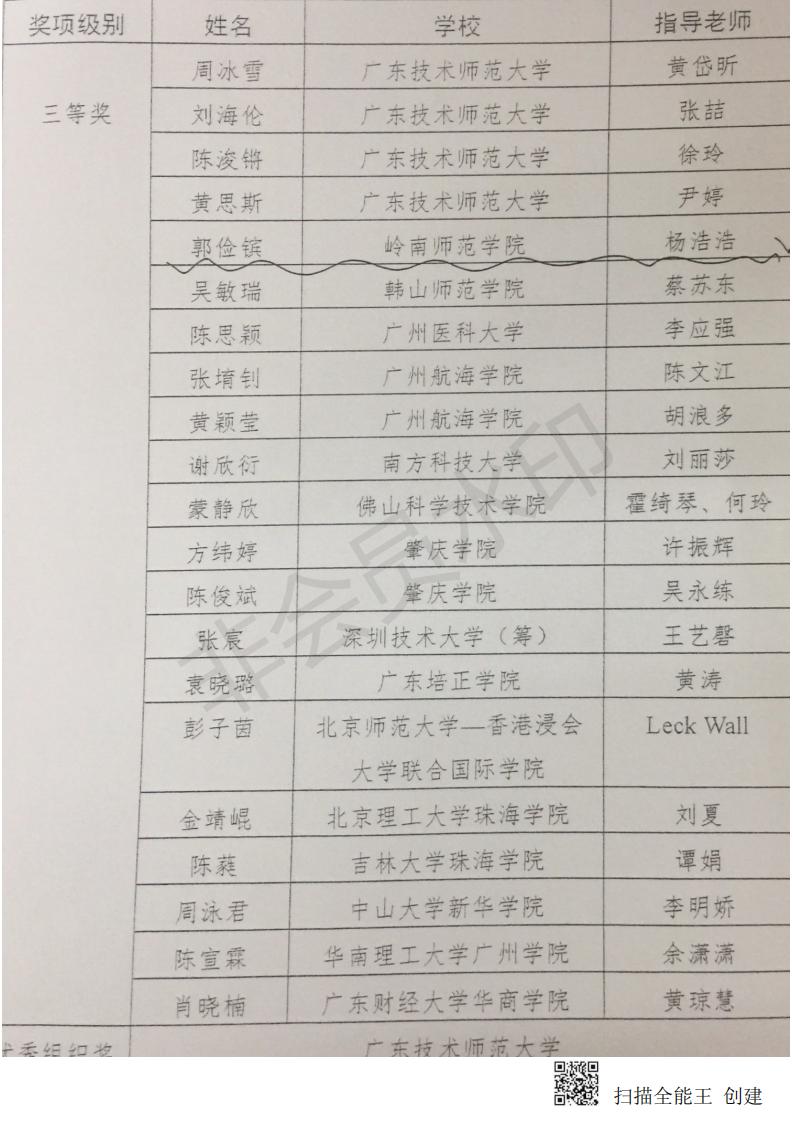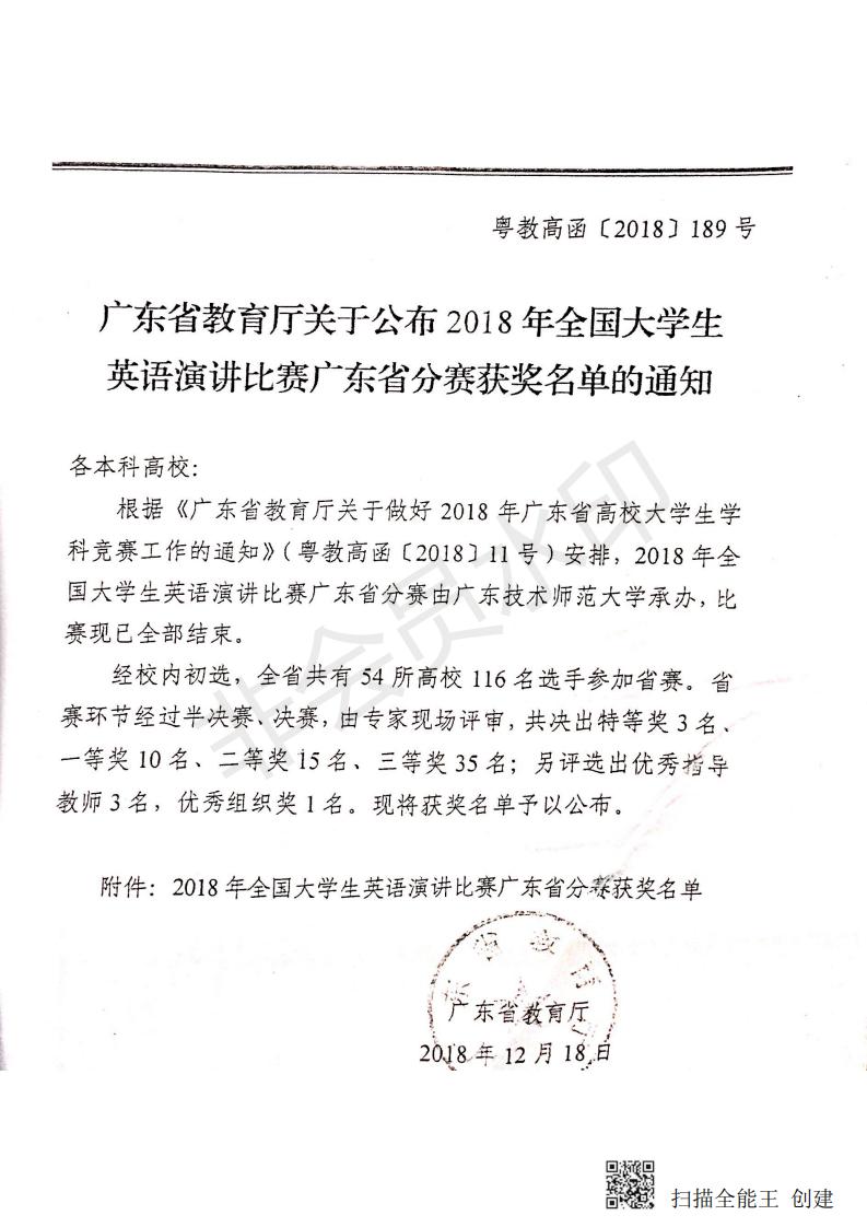 近日,由广东技术师范大学承办的2018年全国大学生英语演讲比赛广东省分赛获奖名单已经揭晓,在此次比赛中,我校外国语学院学子郭俭镔获得三等奖,指导老师为杨浩浩老师。