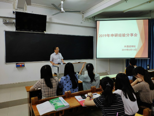 2019年5月13日晚,外国语学院在弘雷楼609教室成功开展了“2019年申研经验分享会”。本次分享会由外国语学院杨进军老师主持,2015级的黄柳倩同学、叶晓红同学、刘诗韵同学及陈凤珠同学主讲,2016级有申研意愿的同学及其他年级感兴趣的同学参加了本次分享会。