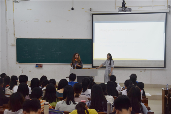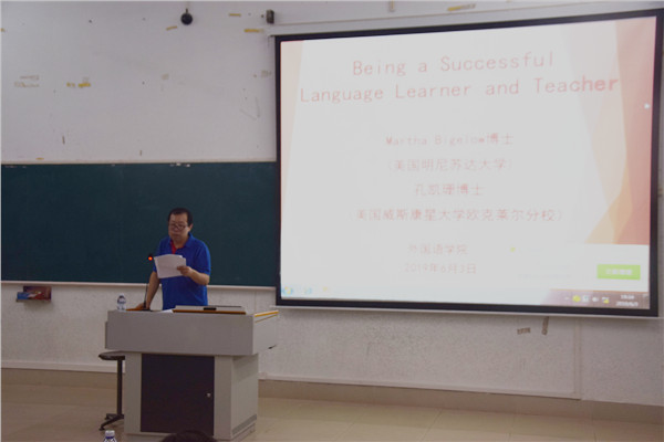 6月3日晚,外国语学院于教三511教室成功举办“Being a Successful Language Learner and Teacher”讲座。本次讲座由英语系主任陈尚真博士主持,来自美国威斯康星大学欧克莱尔分校的孔凯珊博士和明尼苏达大学的Dr.Bigelow博士两位教授主讲,2017级英语系全体学生以及感兴趣的同学参与了本次讲座。