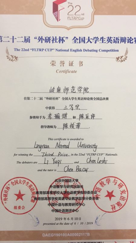 2019年6月6-10日,第二十二届“外研社·国才杯”全国大学生英语辩论赛全国总决赛在北京航天航空大学落下帷幕。本次总决赛共有来自全国各地120支队伍参加,经过6月7-8日两天共计八轮240场循环赛的激烈角逐,最终诞生三十二强队伍。经过八轮循环赛后,由我校外国语学院陈拔萃老师带领的2016级的李瑜琪同学和陈乐诗同学在全国总决赛中表现优异,荣获三等奖,这是本校代表队第三次进军外研社英语辩论赛的全国总决赛。