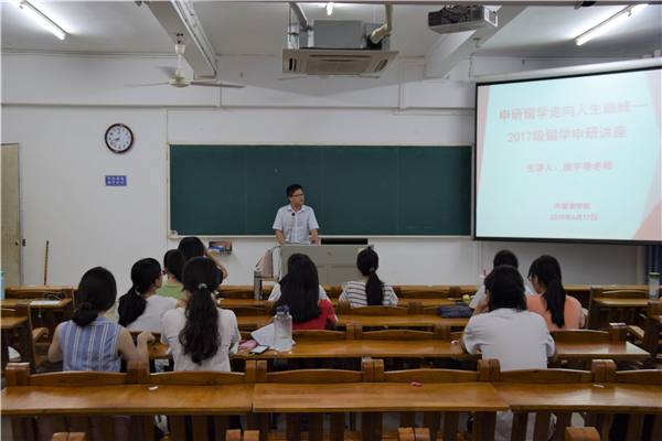 6月17日晚,外国语学院于教三208教室成功举办2017级留学申研讲座。本次讲座由外国语学院梁煜鹏书记主持,庞宇艳老师主讲。2017级有意愿申研以及对申研感兴趣的同学参与了本次讲座。