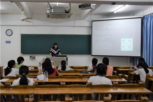 在梁煜鹏书记简单地介绍了庞宇艳老师的申研学习经历后,讲座正式开始。本次讲座主要分为两个部分,一是庞老师提醒同学们申请境外时、国外的大学的研究应该注意的事项及要求;二是庞老师分享雅思备考攻略。