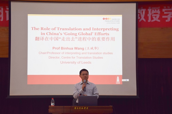 6月24日上午,由科研处和外语院共同承办的翻译与中国“走出去”主题讲座在图书馆二楼报告厅举行。本次讲座由外语院周红辉副院长主持,来自英国利兹大学翻译学中心主任王斌华教授主讲,外语院的部分师生聆听了本次讲座。