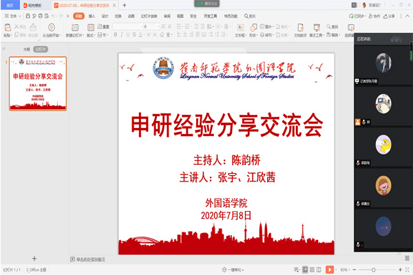 7月8日下午,外语院在腾讯会议上成功举办了线上申研经验分享交流会。此次会议由陈韵桥老师主持,16英语2班的张宇和江欣茜作为主讲人,分享交流会面向所有对申研有兴趣的同学开放。