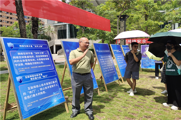 为深入贯彻落实习近平总书记关于网络强国的战略思想和总体国家安全观,学习宣传《中华人民共和国网络安全法》,按照学校的安排,外国语学院党委杨建伟副书记、辅导员罗成燕老师、黄子琦老师带领各大机构的学生干部们参加了在体育馆门前举行的网络安全主题展览活动。