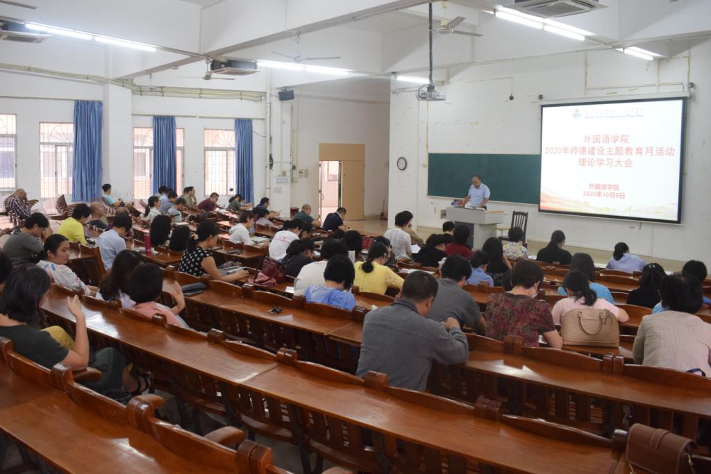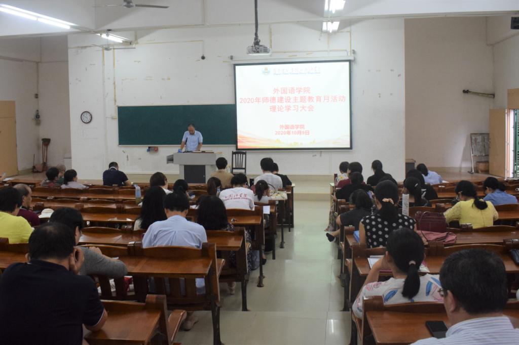 10月9日下午,外国语学院在第三教学楼511教室成功召开“2020年师德建设主题教育月活动”理论学习大会,参与本次会议的有外国语学院主持全面行政工作的吴晓春副院长,党委杨建伟副书记,周扬、陈湛妍副院长及外国语学院全体教职工。此次会议由外国语学院党委书记陈永国主持。