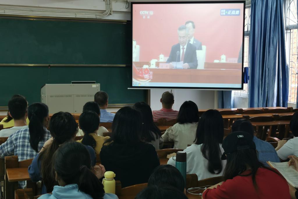 10月14日上午,外国语学院组织学院领导班子、师生党员、学生机构干部在教三703教室集中观看深圳特区建立40周年庆祝大会。