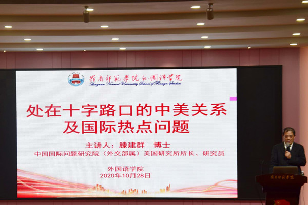 10月28日下午,外国语学院邀请中国国际问题研究院(外交部属)美国研究所所长、滕建群研究员在教三311教室举办了《处在十字路口的中美关系及国际热点问题》的讲座,外国语学院吴晓春副院长和周扬副院长先后主持、总结了活动。