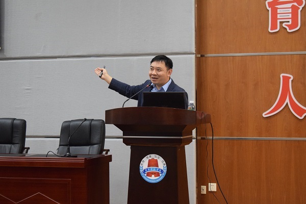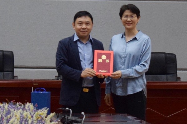 在讲座正式开始前,周扬宣布詹成正式成为外国语学院客座教授,并由吴晓春为詹成颁发聘书。吴晓春首先对詹成受聘岭南师范学院表示由衷的欢迎和感谢,对詹成的研究成果和在口译方面的卓越成绩表示钦佩。她分析了岭南师范学院的现状,并表示希望詹成加盟岭师后,能在翻译学科发展、学术科研和青年教师引领等方面作出具体指导,助力岭师外国语学院学科专业发展。
