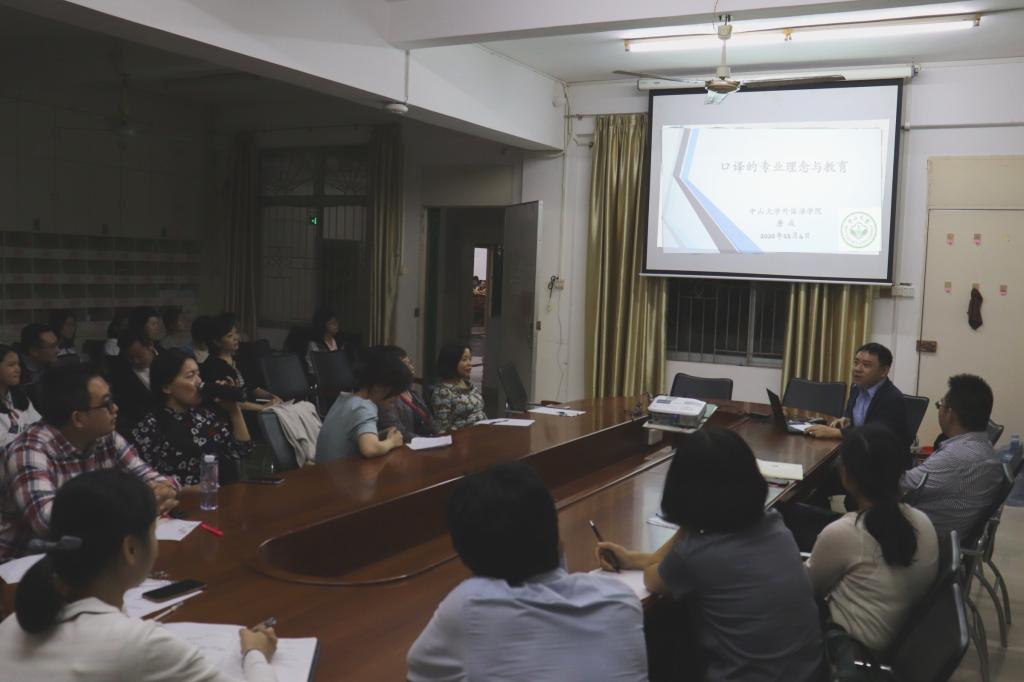 11月4日晚上,外国语学院在学院会议室举办了主题为“口译的专业理念与教育”的讲座,该讲座由周扬副院长主持,中山大学外国语学院詹成教授主讲。外国语学院部分教职工和对口译感兴趣的学生参加了此次讲座。