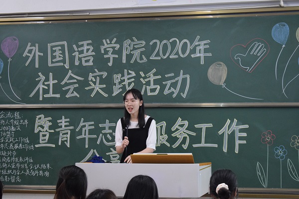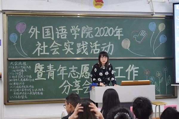 4月17日晚上,外国语学院在教三603教室召开了外国语学院2020-2021学年社会实践活动暨青年志愿服务分享会。外国语学院团委指导老师黄子琦老师,团委秘书团,往届三下乡活动优秀队长代表,优秀志愿者代表,19级团委干部、各二级学院实践部干部,以及20级部分学生参加了此次会议。本次会议由团委青协干部和团委实践部干部共同主持。