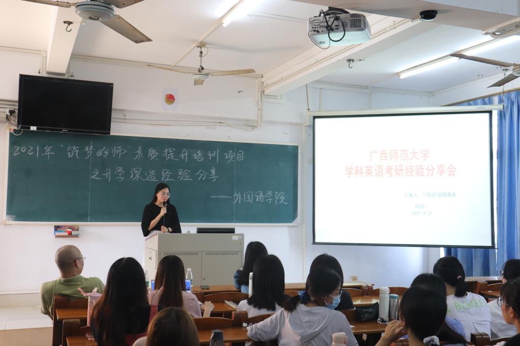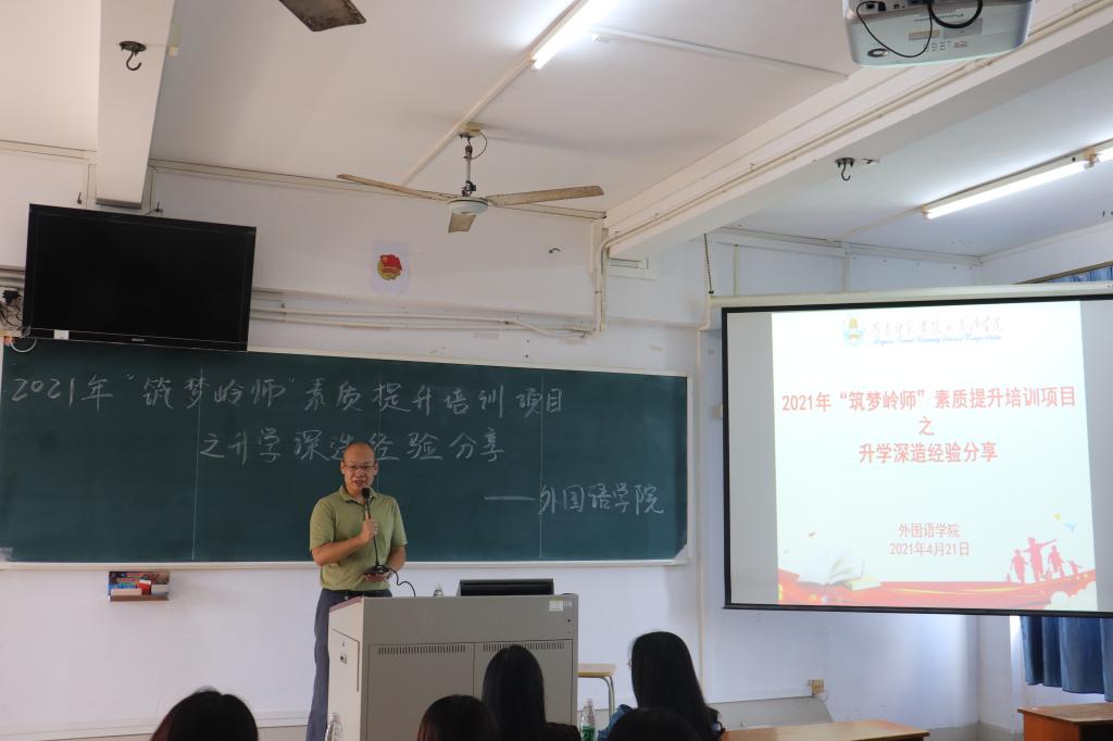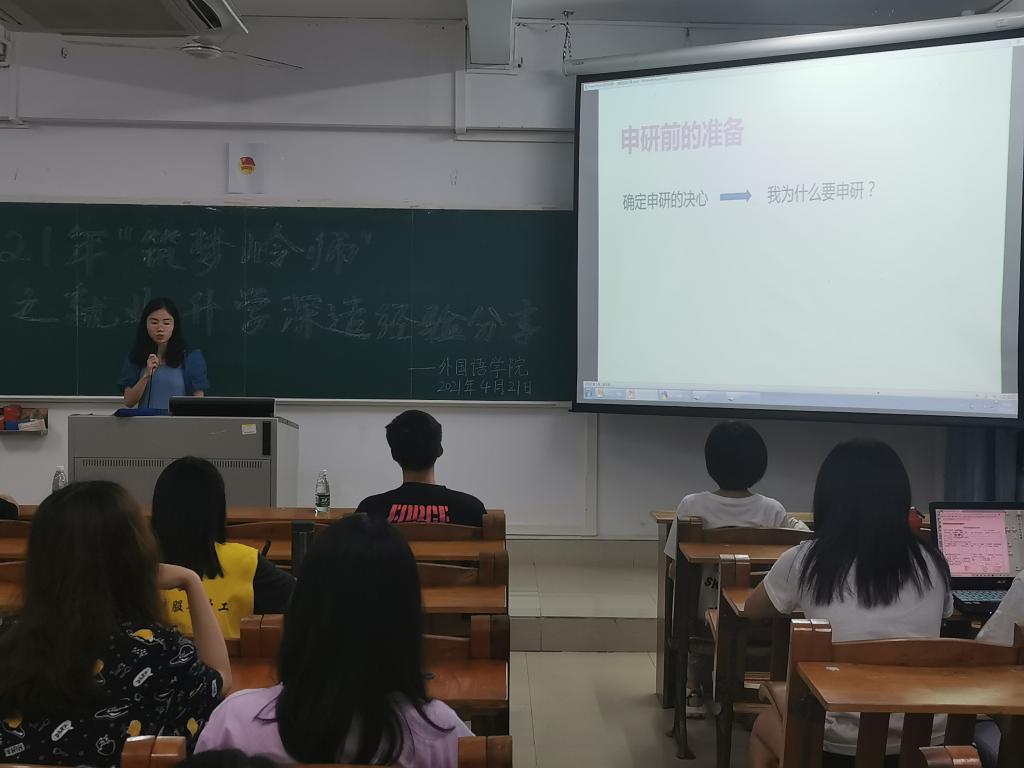 4月21日,外国语学院于教三801室开展2021年“筑梦岭师”素质提升培训项目之升学深造经验分享会。分享会由党委副书记杨建伟主持,来自2017级英语专业的陈采芬和陈施米分别分享了她们的申研和考研心得体会,以及2018级部分英语师范专业的学生参加了分享会。