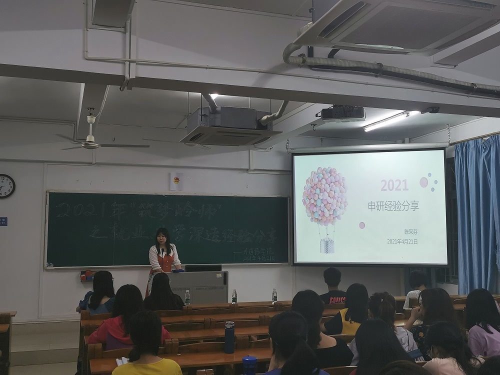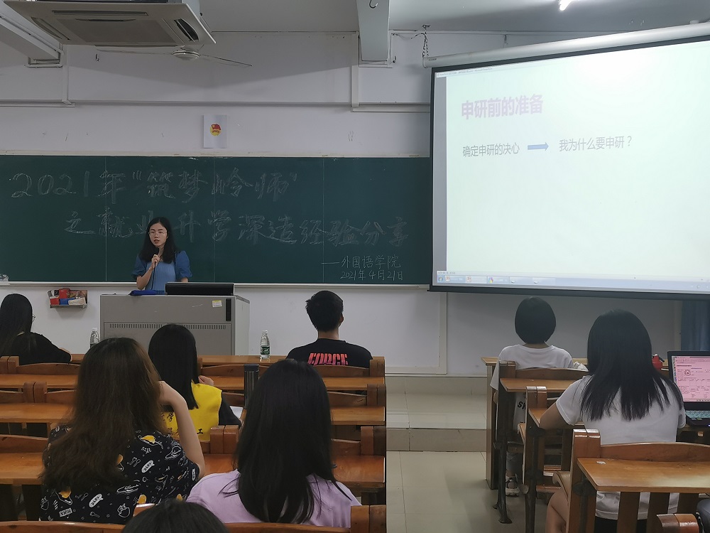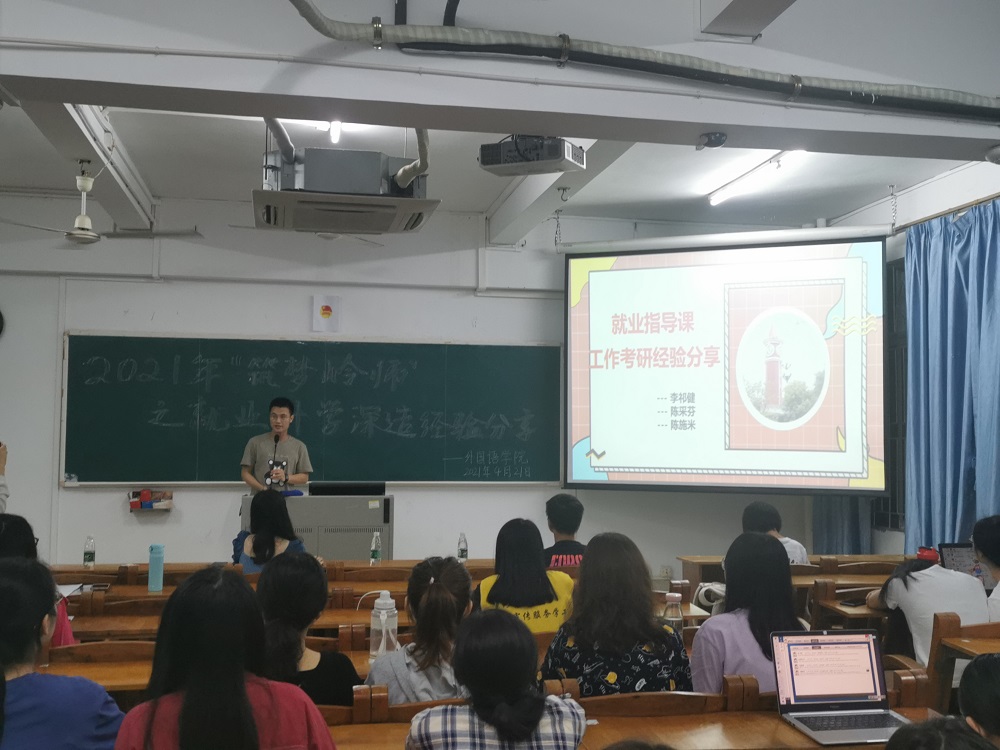 4月21日晚,外国语学院于教三208室举办2021年“筑梦岭师”素质提升项目之就业、升学深造经验分享会。分享会由外国语学院国际商务与外事系邱宇老师主持,来自17英语3班的陈采芬、李祁健和17英语7班的陈施米分别作申研、就业以及考研的个人经验分享。2018级商务英语专业部分学生参加了此次分享会。