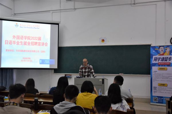 11月14日早上,外国语学院在教三106室开展2022届日语毕业生就业招聘宣讲会,宣讲单位是华希国际教育科技有限公司。外国语学院党委副书记杨建伟主持会议,2022届日语毕业生出席了本次会议。