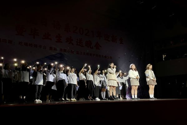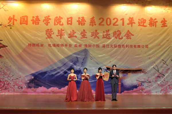 11月26日下午,外国语学院在音乐厅举办外国语学院日语系2021年迎新生暨毕业生欢送晚会。出席本次晚会的有,日本阪田油墨有限公司(茂名)社长石井素功先生一行、外国语学院党委陈永国书记、主持行政全面工作的吴晓春副院长、杨建伟副书记、周扬副院长、曹耀萍副院长、陈湛妍副院长以及日语系全体师生。