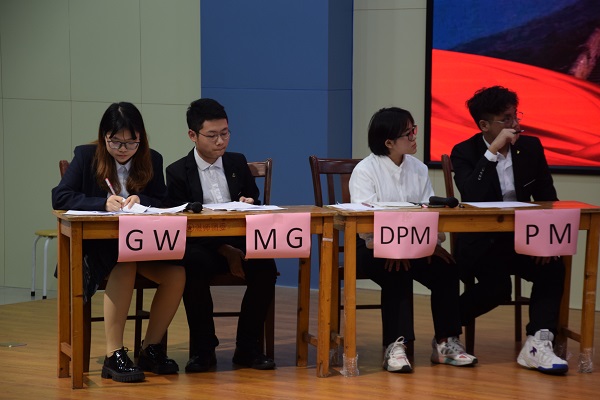 主持人以标准流利的英文致欢迎辞并介绍完来宾后,选手们依次上台发表观点。在比赛过程中,各选手条理清楚、目光坚定,掷地有声的辩论给在场的所有人留下了深刻的印象。作为第一个出场的选手,许烨炜表示,“虽然我的内心非常紧张,但是不断调节情绪,做到了从容发言。” 谈及比赛准备时,杨芸舟选手这样回答,“平时我有阅读外刊和积累的习惯,经常会从以前参加过的比赛汲取经验,比赛前也一直和搭档在磨合。”评委们认真做好记录工作,为评比做充足的准备。
