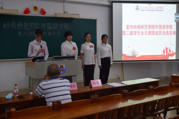 此次大会审议通过了《学生会工作报告》,表决并同意了《岭南师范学院外国语学院学生会章程(修订稿)》和《外国语学院第二次学生代表大会选举办法》。并且审议通过了大会总监票人名单,推选了卢莉珊、陈慧冰、黄宝榆三人当选为外国语学院新一届学生会主席团成员。