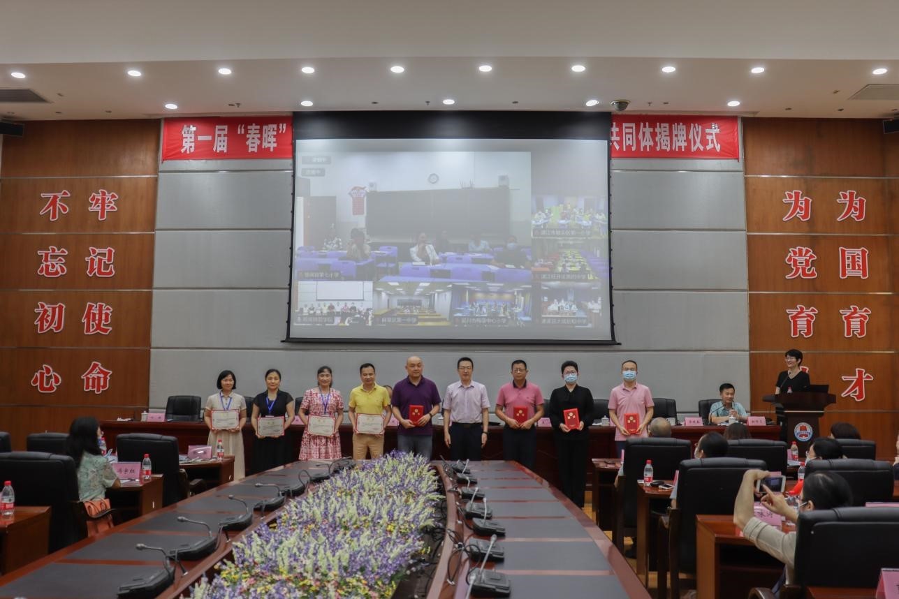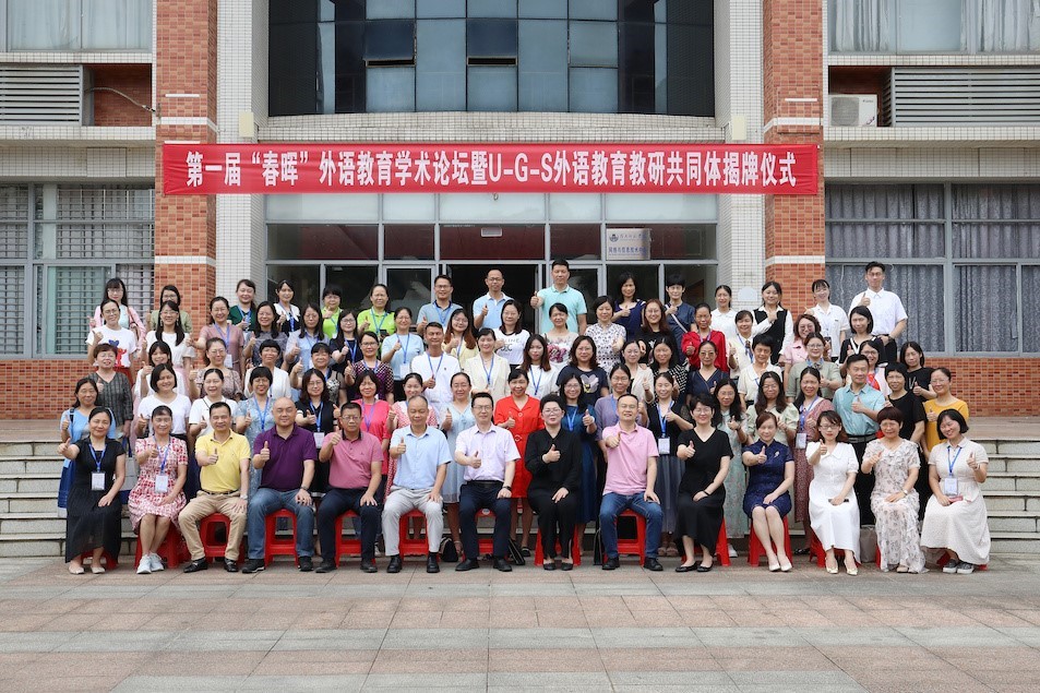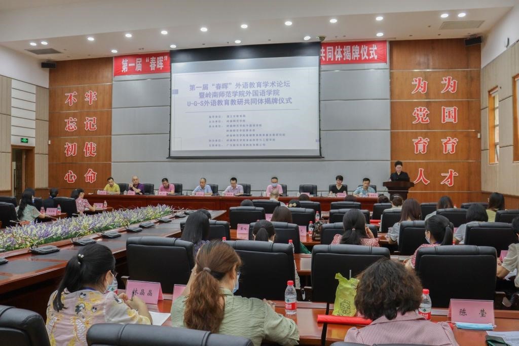 6月10日下午,由外国语学院承办的第一届“春晖”外语教育学术论坛暨U-G-S外语教育教研共同体揭牌仪式在国际会议厅举行。论坛以线上线下相结合方式举行。岭南师范学院副校长金义富、基础教育高质量发展研究院主任吴涛,湛江市教师发展中心主任王淑丽,湛江第一中学党委书记兼校长郑军,湛江第二中学霞山校区校长陈育新,湛江一中培才学校常务副校长叶译,湛江市教育局教研室,赤坎区、霞山区教师发展中心,岭师附中、湛江一中培才学校、湛江体育学校等25所中小学教师代表在现场参加论坛。湛江市经开区、麻章区、各县市线上参会单位达57家。线上线下参与人数6200余人。第一阶段学院主持行政全面工作的副院长吴晓春致欢迎辞并主持揭牌仪式,第二阶段学术论坛由刘玉梅教授主持。