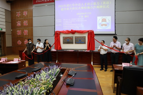 6月17日下午,岭南师范学院外国语学院在国际会议厅举办了2022年湛江市外语人才语言能力(英语)提升班开班仪式暨校地合作签约揭牌仪式。岭南师范学院副校长苏古发、国际交流处处长郑志军、外国语学院书记陈永国、外国语学院主持行政全面工作的副院长吴晓春,湛江市委外事工作委员会办公室主任王敦滟、办公室副主任王标、四级调研员林丽,以及校地合作办公室负责人等一同出席了签约揭牌仪式。吴晓春主持签约揭牌仪式。