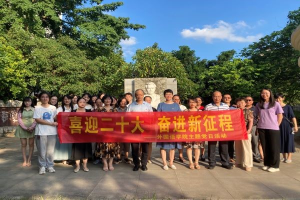 百年风华,红色印记。红色名片,熠熠生辉。七一建党节来临之际,为庆祝中国共产党成立101周年,弘扬爱国主义精神,迎接党的二十大胜利召开,6月24日,外国语学院党委组织各支部于谭平山纪念园组织开展“喜迎二十大、奋进新征程”主题党日活动,活动由外国语学院陈永国书记主持,外国语学院各党支部全体师生党员参与。