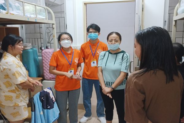 外国语学院党委陈永国书记、吴晓春副院长(主持全面行政工作)、杨建伟副书记亲临现场,满怀喜悦之情,细致指导迎新工作,新生在各位助理班主任和值班干部的指引下有序排队,完成信息录入、领取相关物资等报到流程,与此同时,院领导对新生表达了亲切的慰问,并深切关怀学院首次招收的新疆籍学生,不少幸运学子收到了学院赠予的新生大礼包,20级商务英语2班汪景有现任22级商务英语班助理班主任,他表示,做好充足的准备后,十分期待新生的到来,同时又带着一丝对未知的紧张,祝愿一切工作顺利进行,确保每个新生都符合疫情防控标准,安全到校。晚间,各班主任与助班们共同走访新生宿舍,交代在校学习与生活中的各类注意事项,引导同学们互相熟悉、相互交流、共同成长,汪景有说道:“祝愿各位同学早日适应崭新的大学生活,寻找自我前行的方向,也希望大家能够凝心聚气,发掘班级特点,团结一致,共同建设一个优秀的班集体。”