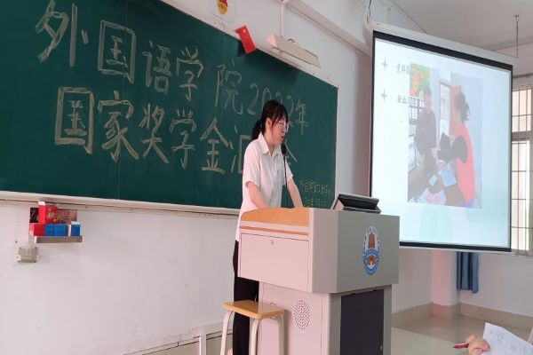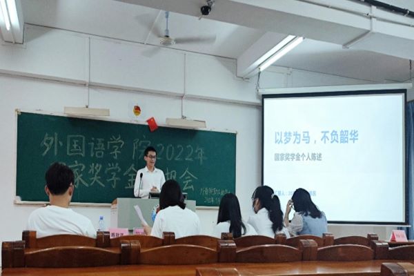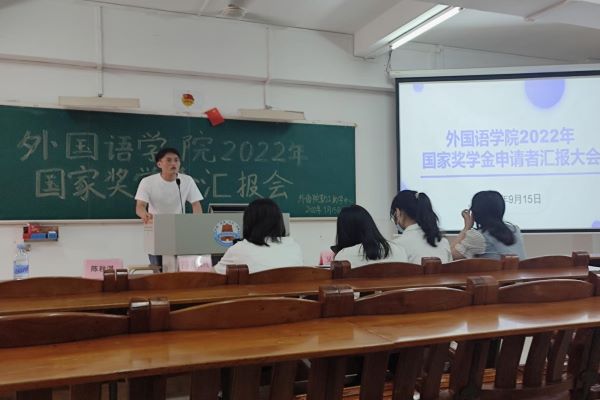 为进一步加强学校学风建设,充分发挥优秀学子的榜样引领作用,激励广大学生全面发展和成长成才,9月15日中午,外国语学院在教三405召开了国家奖学金申请者汇报大会。学院评委老师、各机构代表、各班级代表以及国家奖学金申请者参加了本次汇报大会。