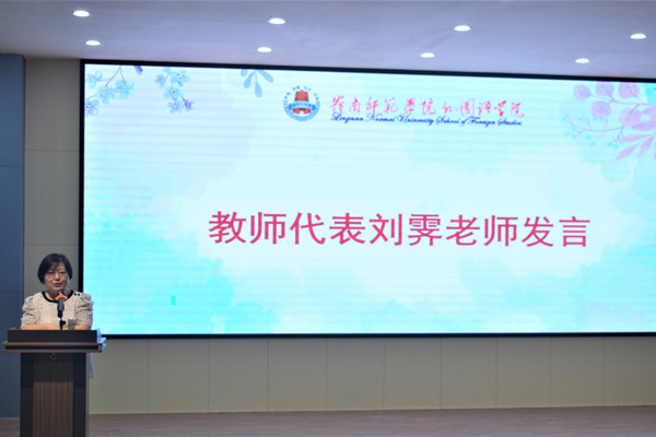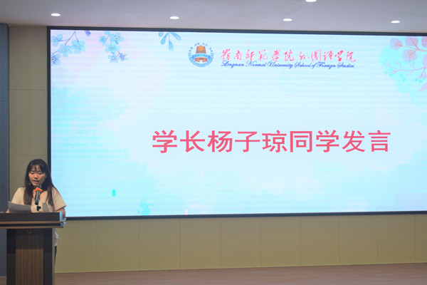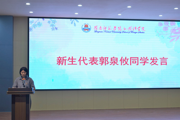 19级学姐代表杨子琼用她三年的奋斗证实了合理利用时间做有意义的事情能让灵魂独立而自由地成长。提到新生的焦虑,她认为,过去已成往事,所有的选择都值得被认真对待,学会接受曾经、接受结果,才能打败焦虑。人生不能给自己设限,万事皆有可能。新生代表郭泉攸对大学生活充满了期待,她表示会谨记前辈的教导,向优秀师兄师姐学习,珍惜美好青春年华,成为自己想成为的优秀外语人才。