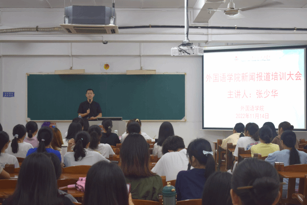 11月14日晚,外国语学院在教三405教室开展了以“守正创新:做岭师故事的书写者,岭师声音的传播者”为主题的新闻报道培训大会。此次大会由外国语学院辅导员陈秋湛主持,党委宣传部张少华主讲。出席本次会议的有:外国语学院辅导员宋水凤、黄子琦和外国语学院各个机构干部。