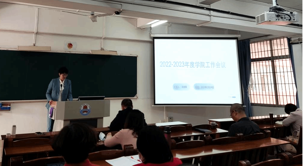 吴晓春副院长(主持)作年度工作讲话,回顾外国语学院2022年主要工作成效和部署2023年工作计划。吴晓春指出,2022年,外国语学院深入学习宣传党的二十大精神,在学校党委的坚强领导下,全院师生坚守立德树人初心使命,创新务实,踔厉奋发,想在一起、干在一起,取得了一系列成果。学院加强党的建设,推动支部建设规范化标准化以及教职工理论学习常态化长效化;课程思政工作进展有序,获批校级课程思政示范学院、示范专业、示范课程等;本科专业一流课程建设成果显著,成功入选省级线上一流课程和校级线上线下混合一流课程;凝聚专业力量,夯实学术建设,成立U-G-S外语教育教研共同体并成功主办第一届“春晖”学术论坛,中标国家社科基金后期资助一般项目1项,实现国家级项目零的突破;提高学生专业技能,提升人才培养质量,学生参赛斩获国家级奖项73项、省级奖项38项,开展口语实践活动覆盖湛江市中学生1000余人次;提高人才培养质量,积极谋划人才工作创新发展,派遣教师参加学术会议、组织教师参加线上线下各类培训;加强校企合作,密切联系校友,调研企业人才需求,整合校友企业资源,发挥校友情怀力量,进一步拓展毕业生就业渠道,助力2022届毕业生充分就业和高质量就业。