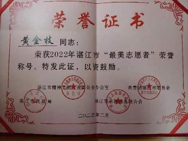 谈及获得“最美志愿者”这个称号的感想时,黄金枝说道:“当我得知自己成功被选为‘最美志愿者’时,我觉得很意外也很开心。湛江市内有很多同样热衷于志愿活动的优秀志愿者,而‘最美志愿者’的称号名额是有限的。我觉得自己还是很荣幸能得到这个称号,这证明大家对我的认可,也让我更加坚定自己积极参与志愿实践活动的初心。”