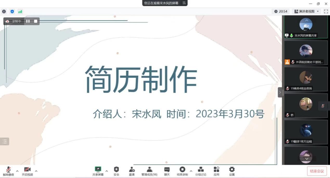 3月30日下午和31日晚上,外国语学院线上召开以“青春践行二十大,助力启航逐梦想”为主题的2019级的第二期就业推进会。此次大会由外国语学院19级辅导员陈韵桥主持,校友佛山市顺德高中英语老师梁惠林主讲,辅导员宋水凤介绍简历制作内容,词源教育负责人进行宣讲。出席本次会议的有:党委书记陈永国和2019级毕业生。