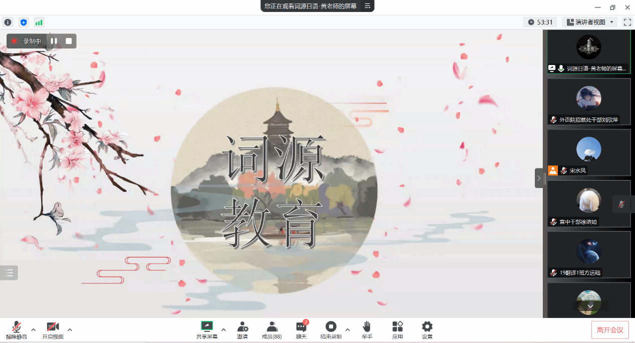 词源教育机构负责人线上进行宣讲,他从企业简介、组织架构、岗位信息、培训晋升、学生风采、福利待遇、办公环境、周边环境、宿舍环境等方面向毕业生们介绍。