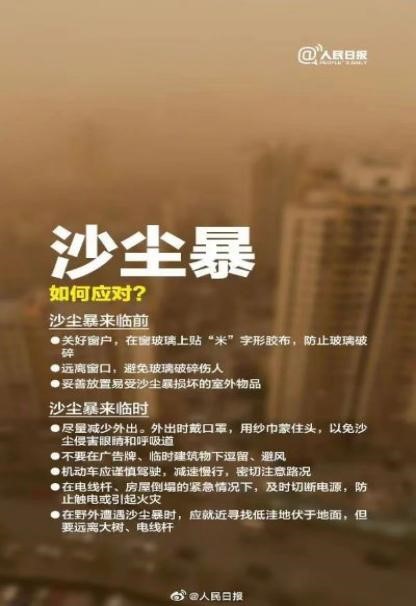 当沙尘暴来临时,尽量减少外出。外出时戴口罩,用纱巾蒙住头,以免沙尘侵害眼睛和呼吸道;不要在广告牌、临时建筑物下逗留、避风;机动车应谨慎驾驶,减速慢行,密切注意路况;在电线杆、房屋倒塌的紧急情况下,我们要及时切断电源,防止触电或引起火灾;在野外遭遇沙尘暴时,应就近寻找低洼地伏于地面,但要远离大树、电线杆。