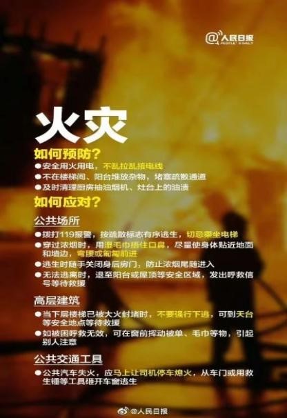 如果发生火灾,在公共场所中,我们应及时拨打119报警电话,按疏散标志有序逃生,切忌乘坐电梯;穿过浓烟时,要用湿毛巾捂住口鼻,尽量使身体贴近地面和墙边,弯腰或匍匐前进。在逃生时,我们可以随手关闭身后房门,防止浓烟尾随进入;在无法逃离时,我们可以退至阳台或屋顶等安全区域,发出呼救信号等待救援。