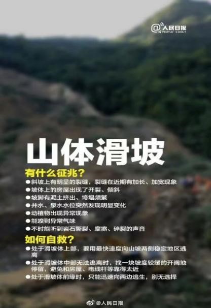 当山体滑坡来临前,我们可以看到斜坡上有明显的裂缝,裂缝在近期有加长、加宽现象;坡体上的房屋出现了开裂、倾斜;坡脚有泥土挤出、培塌频繁;井水、泉水水位突然发现明显变化;动植物出现异常现象;能嗅到异常气味;不时能听到岩石撕裂、摩擦、碎裂的声音。