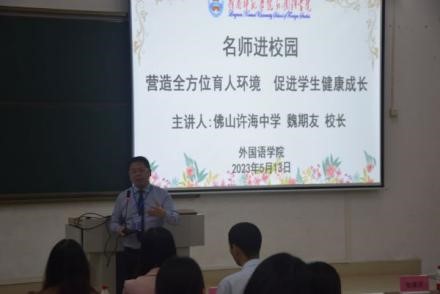 5月13日晚上,外国语学院在教三311开展“名师进校园”讲座活动,该活动也是2023年岭南师范学院“新师范”建设学术论坛活动之一。本次活动邀请优秀校友佛山许海中学党委支部书记、校长魏期友、教导处主任王才海、七年级主任郑学霓(主管行政)、七年级级长陈婉灵为外国语学院英语系学生开讲。外语院副院长曹耀萍出席本次会议,会议由英语系主任古永辉主持。