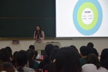 郑学霓以“自我增值与提供价值“为主题向同学们介绍应如何打造教师职业核心竞争力。她首先回顾了十年的职业生涯,与同学们分享在职业生涯中所遇到的困难,并就自身经历总结告诫同学们要勇敢走出自己的舒适圈,向上生长,从而实现自我增值、自我发展,还要学会在成长中不断自洽,提升自我认知。最后,郑学霓向参加此次讲座的准教师们提出建议要“循梦而行,向阳而生; 心之所向,素履以往”。