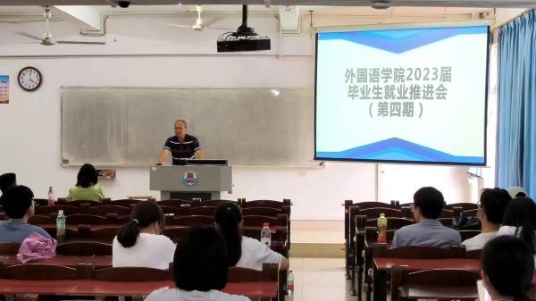5月7日下午,外国语学院在教三907召开了2023届毕业生就业推进会。出席本次会议的有:外国语学院党委副书记杨建伟和2019级毕业生,此次大会由外国语学院19级辅导员陈韵桥主持。