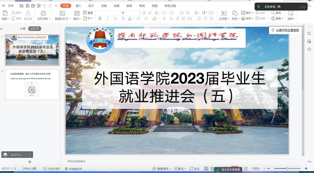 为帮助应届毕业生准确有效地确定就业方向,引导学生树立正确的就业观,推动毕业生顺利就业,6月2日上午,外国语学院召开线上毕业生就业推进会。外国语学院党委副书记杨建伟、辅导员陈韵桥、符琪琪、吴玉莹及2019级全体学生参加了此次会议。会议由陈韵桥主持。