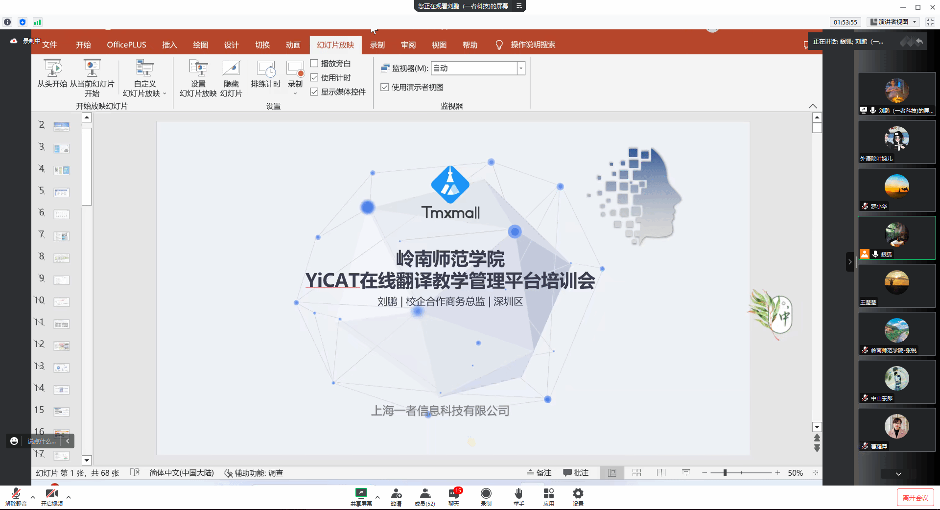 2023年6月15日19:30,上海一者信息科技有限公司校企合作商务总监刘鹏在腾讯会议为我院教师开展了一场YiCAT在线翻译教学管理平台培训会。外国语学院全体教师参加了此次培训会,培训会由外国语学院副院长周扬主持。
