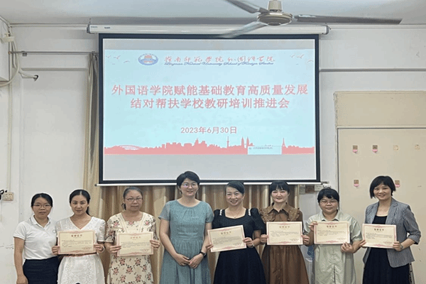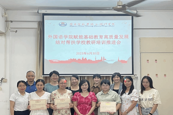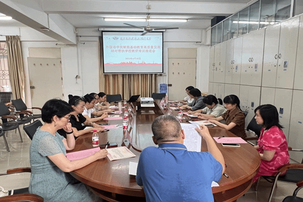 6月30日下午,外国语学院在学院会议室召开赋能基础教育高质量发展结对帮扶学校教研培训推进会。外国语学院党委书记陈永国,外国语学院副院长吴晓春(主持行政全面工作),外国语学院“U-G-S外语基础教育教研共同体”副组长刘玉梅教授,湛江市第十五小学、湛江市第二十四小学及湛江市第二中学、茂名市博雅中学英语教师团队参与了本次会议。本次会议由刘玉梅主持。