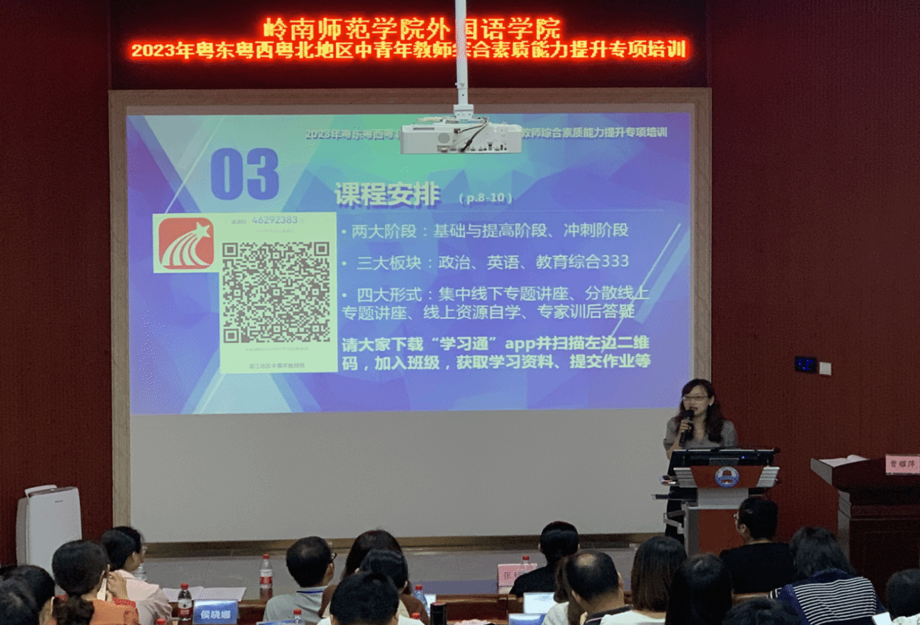 2023年8月11日(周五)上午,岭南师范学院承办的2023年粤东粤西粤北(湛江地区)中青年教师综合能力提升专项培训班在榕楼105举行了开班典礼。岭南师范学院省级中小学教师发展中心副主任兼非学历教育管理办公室副主任张妙龄、外国语学院副院长曹耀萍、外国语学院办公室主任翁惠萍、英语系副主任唐汉娟以及湛江县域中学的70名参训学员等出席了典礼。开班典礼由班主任唐汉娟主持。