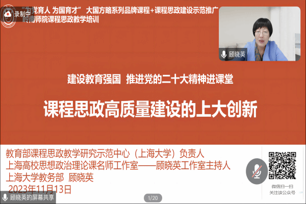 11月13日晚,外国语学院通过腾讯会议成功举办了主题为“课程思政高质量建设的上大创新”的讲座。本次讲座由上海大学教务部顾晓英教授主讲,由外国语学院院长吴晓春主持,外国语学院全体教师参加了本次讲座。