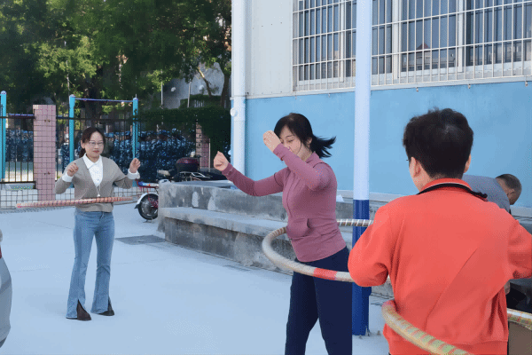 (老师们在参加“呼啦圈”比赛项目)