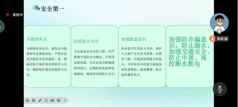 在会议中,陈秋湛详细阐述了留宿期间的注意事项。他强调,安全是假期生活的重中之重,同学们要严格遵守宿舍管理规定,不使用违规电器,注意防火、防盗、防诈骗;要严格遵循学院的考勤和请假制度,坚持每晚进行安全打卡,以确保学院和老师能够掌握同学们的行踪和安全情况;有紧急情况立即联系老师,学院将始终关注每一位同学的成长,为大家提供支持和帮助。