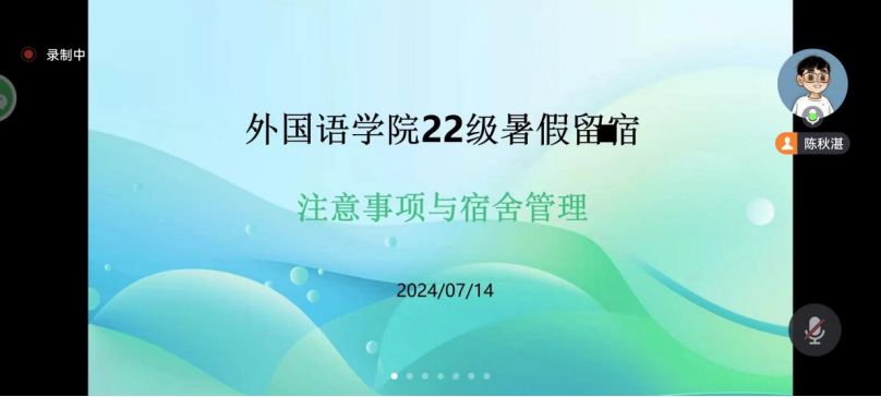 7月14日,外国语学院召开2022级暑假留宿学生安全教育会议,本次会议由22级辅导员陈秋湛老师主持。本次会议旨在帮助同学们度过一个安全、充实、有意义的假期。